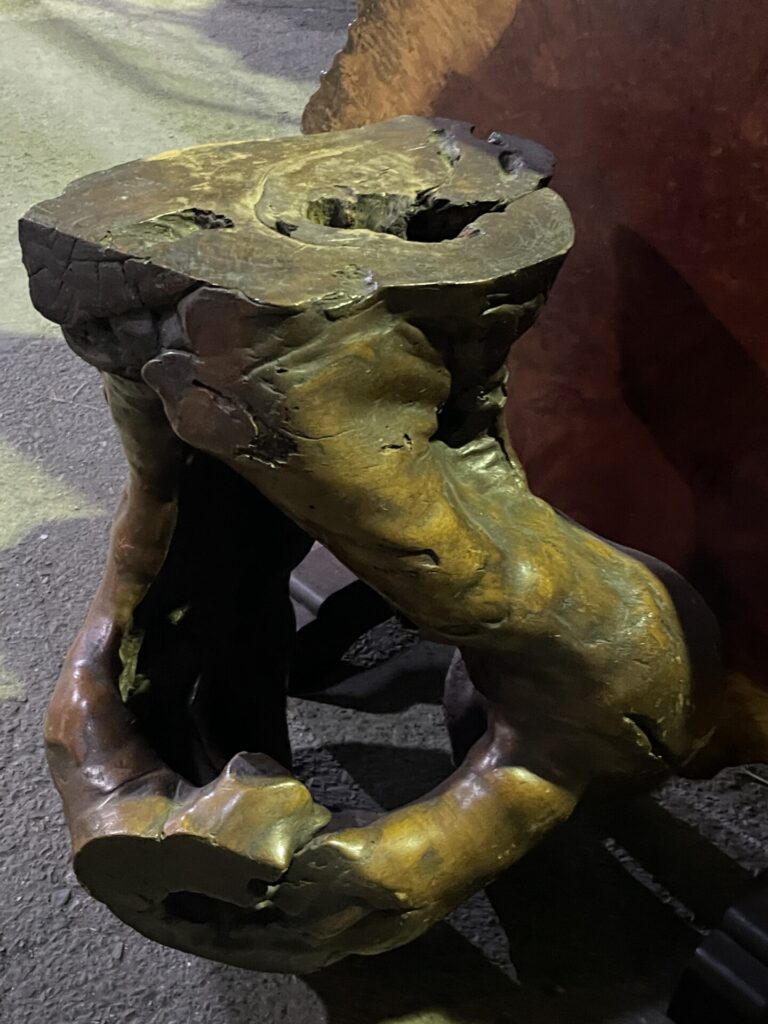 天板が 美しい木目の出た、玉杢と呼ばれる木の板でできており、足の部分は天然の木の根っこになっているというお品物です。