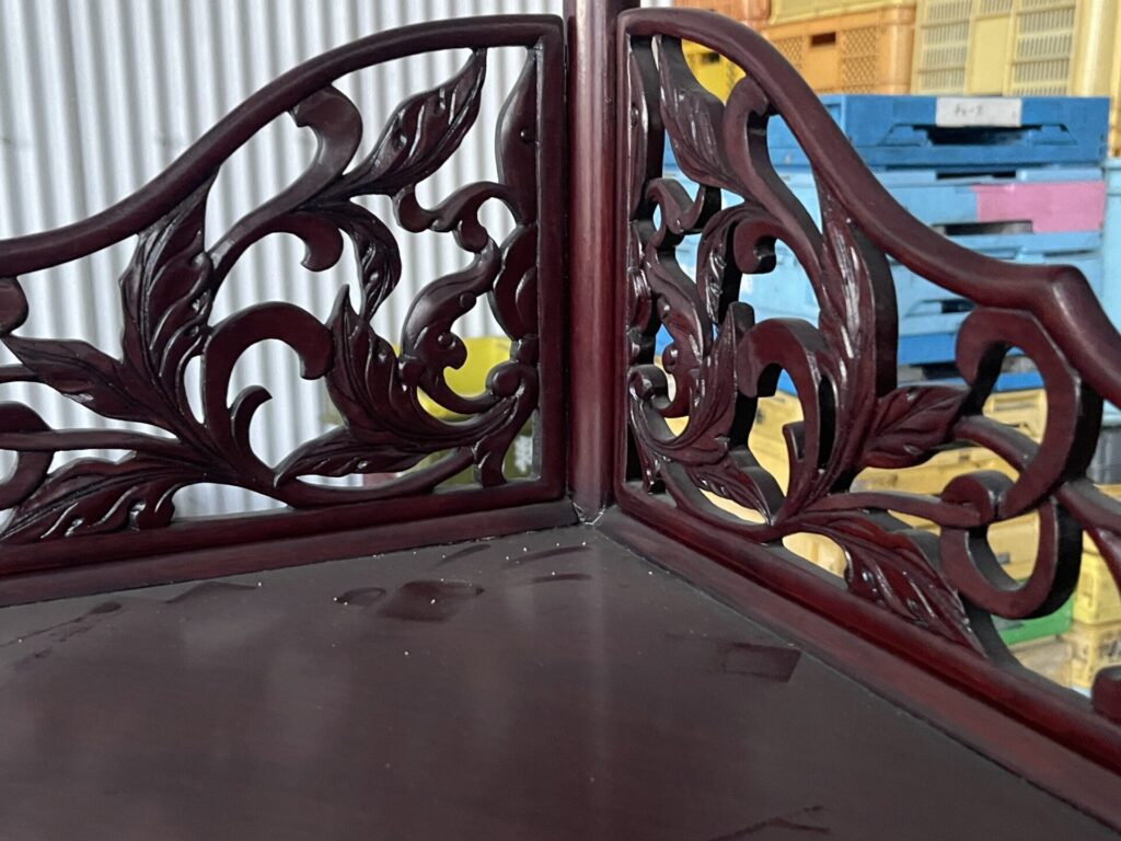透かし彫りの入っているコーナーラックは、東南アジア原産で、中国の方々などから人気の高い唐木を使っており、
